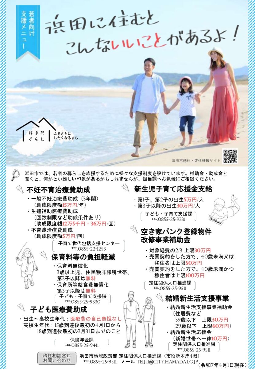 また、浜田市の保育料は3歳以上児が無料、3歳未満児が国の6割(同時入所の場合第2子は1/2)、第3子以降は無料と、子育て世代の負担軽減を行っています。